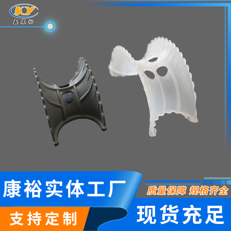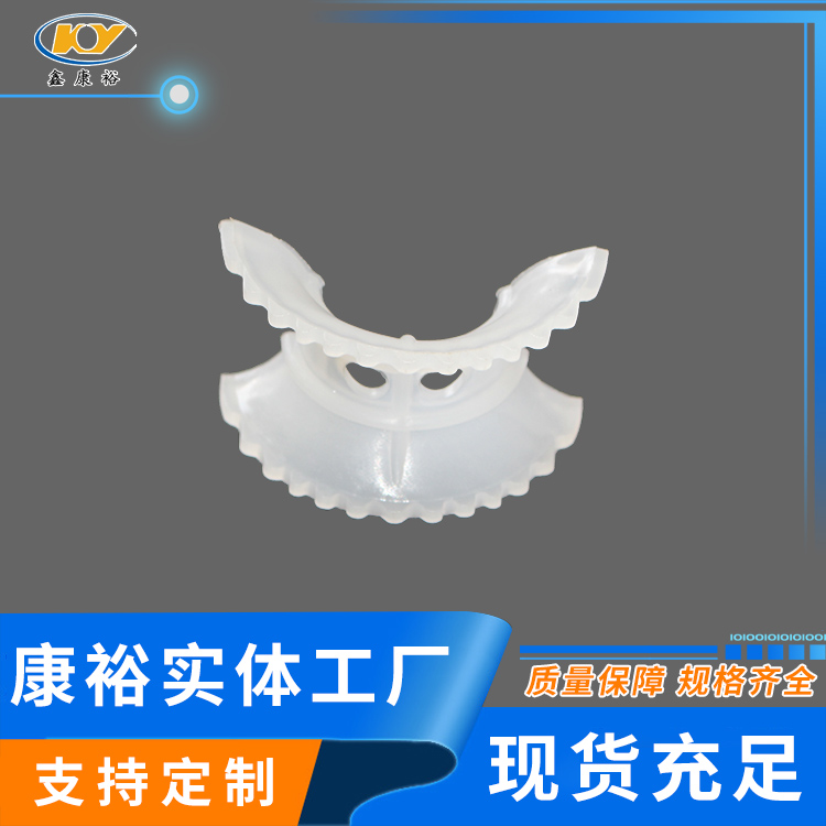 塑料異鞍環(huán)是20世紀(jì)70年代美國Noton公司對普通矩鞍環(huán)填料作出了改進(jìn),其特點(diǎn)是將扇形弧面改進(jìn)成帶鋸齒邊緣的貝殼狀弧面,并在鞍背上增加了開孔,這樣填料層內(nèi)的通道更加通暢,改善了液體分布性能,降低了氣體通過的阻力,提高了傳質(zhì)性能。塑料異鞍環(huán)鞍形填料類似于馬鞍形狀,這種填料層中主要為弧形的液體通道,填料層內(nèi)的空隙較環(huán)形填料(尤其較拉西環(huán)填料)更加連續(xù)。